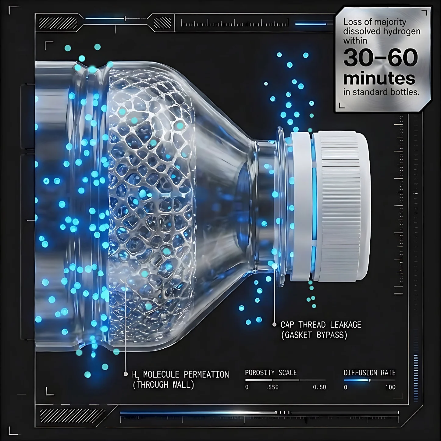 Molecular hydrogen (H₂) is the smallest molecule in the universe. It penetrates through plastic walls, escapes through rubber gaskets, and dissipates through any non-metal barrier. In a standard bottle, you could lose the majority of dissolved hydrogen within 30-60 minutes.