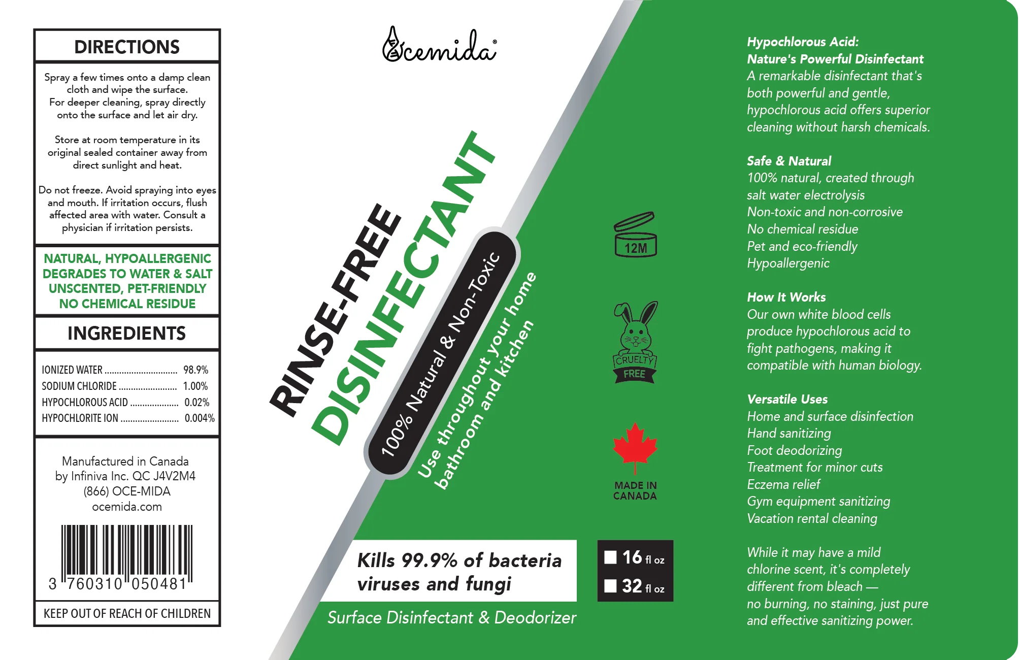 Simple, Clean Formula: Contains only hypochlorous acid and salt. No harsh chemicals or artificial fragrances added. Can be used without protective equipment, produces no strong fumes, and is suitable for people with chemical sensitivities.